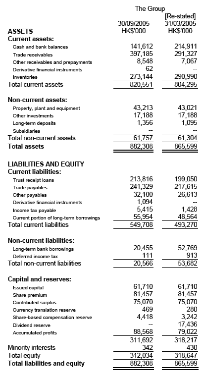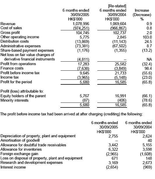 There was a slight increase in gross margin from 9.61% for the six months ended 30th September 2004 to 9.71% for the same period of 2005. There has been pressure on the gross margins since the second half of last year. The Group’s competitive pricing strategy amidst the general market downturn and intense competition in the PRC’s electronics market led to a low gross margin for the first four months of the period under review. However this negative effect was more than offset by the unexpected surge in demand from the export-sales customers in the last two months of the first half year, thus slightly increased the overall margin for the first half year as compared with that of last year. The increase in distribution costs to HK$13.9 million, as compared with that of last year of HK$11.1 million, was mainly due to the increase in sales and marketing activities in a tough and difficult market environment, especially in China. Administrative expenses increased by HK$5.9 million, from HK$67.5 million for the six months ended 30th September 2004 to HK$73.4 million for the same period of 2005. The increase was due to the rise in staff costs as a result of hiring more staff and salary increment, more rental expenses for renting more warehouse space and expanding our Shanghai Office, and the set up cost of Taiwan Office. Finance costs increased by HK$3.8 million, from HK$3.8 million for the six months ended 30th September 2004 to HK$7.6 million for the same period of 2005. It was mainly attributable to the rise in interest rates. The increase in other operating income was mainly due to higher bank interest income from the increased interest rates and the higher commission income received from our major principal as an incentive rebate for achieving certain sales target. Financial Position The stock holding period was also maintained at about 2 months while the inventories level was reduced slightly from HK$291.0 million as at 31st March 2005 to HK$273.1 million as at 30th September 2005. Cash Flow Cash outflow from operating activities was mainly attributable to an increase of trade receivables along with the increase in sales in the current period when compared with that of 2005. The Group did not raise any bank loans during the period which resulted in a cash outflow from financing activities in the current period. |